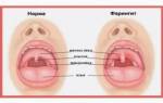 Также, при осмотре, визуализируется покраснение горла, в зависимости от типа возбудителя, может быть виден венозный рисунок, фолликулы, отек мягкого неба, небного язычка и задней стенки.